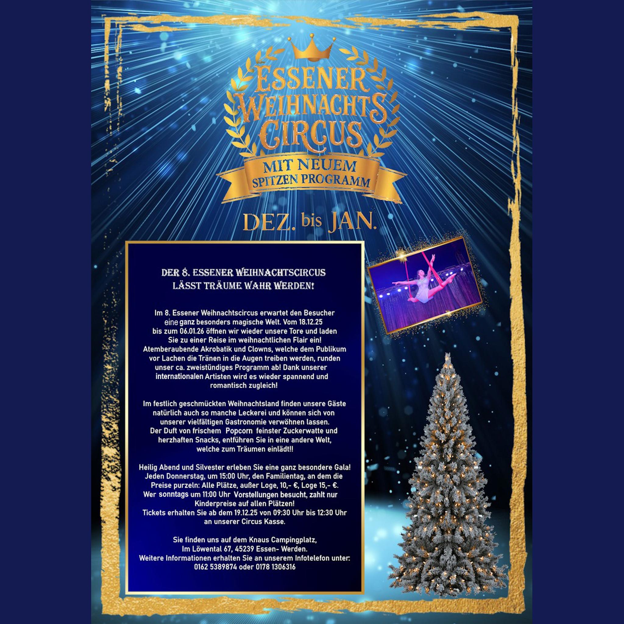 Manege frei! Vom 18.12.2025 bis 6.01.2026 bietet der Weihnachtscircus Altano direkt im KNAUS Campingpark in Essen spannende Shows voller Akrobatik, Clowns und Artistik. Die Adventszeit wird magisch. Die Manege wird festlich geschmückt, es gibt Popcorn, Zuckerwatte und andere Köstlichkeiten. Heiligabend und Silvester gibt es jeweils um 13 Uhr spezielle Gala-Vorstellungen. Nach weihnachtlicher Show lasst Ihr den Abend im gemütlichen Camper ausklingen.